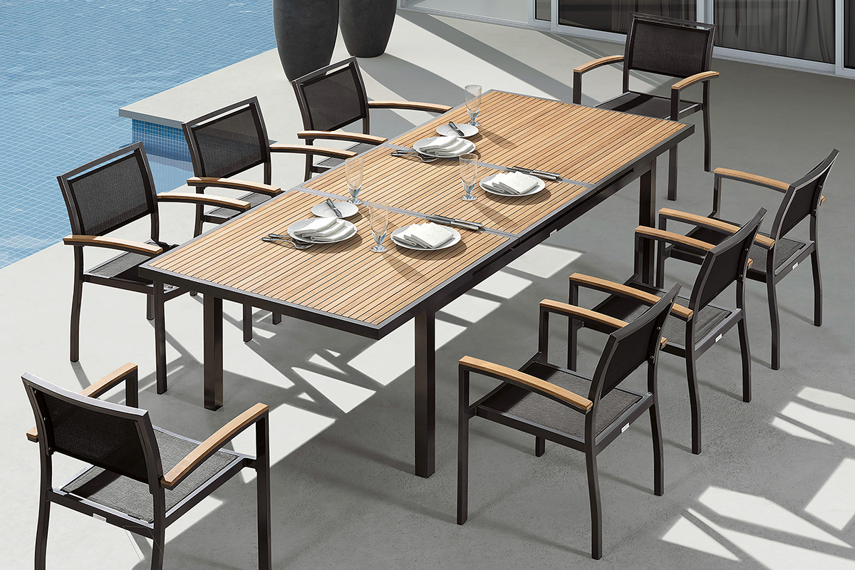 – il teak, per il piano del tavolo, è senza alcun dubbio uno tra le tipologie di legno annoverati tra i migliori materiali impiegati per l’arredamento da esterno: è infatti un legno robusto, durevole e il più nobile nel suo genere. Oltre ad essere molto resistente, presenta inoltre una superficie che non teme le infiltrazioni di acqua, una delle principali, se non la principale causa di deterioramento dei mobili da giardino;
