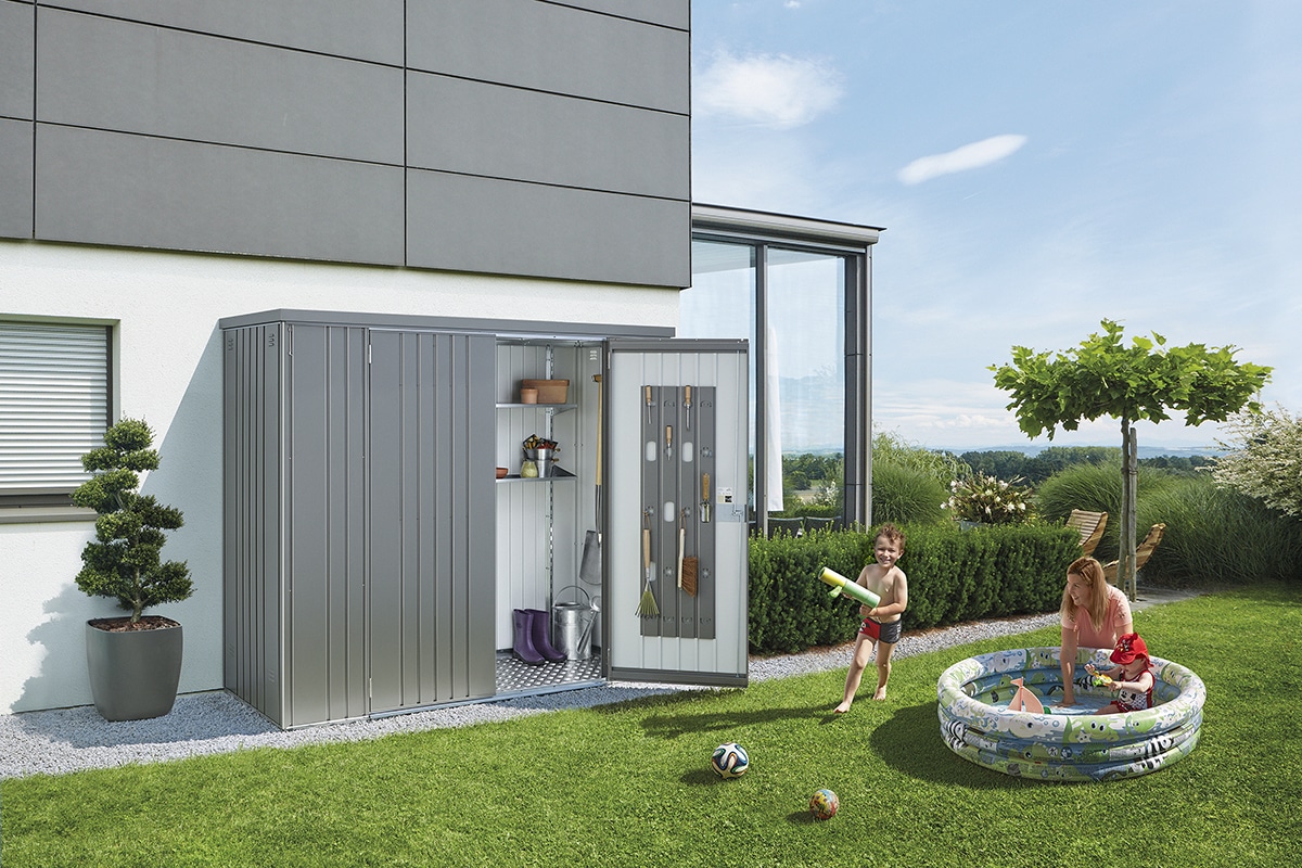 Progettate per offrire la massima praticità e durabilità. Realizzate in acciaio zincato a caldo e verniciato a polvere, resistono alle intemperie e richiedono poca manutenzione. Tra i modelli più apprezzati troviamo il Casa Nova, una casetta moderna e spaziosa che combina estetica e funzionalità. Le sue ampie porte e le pareti interne modulari permettono un’organizzazione ottimale degli attrezzi e degli arredi da giardino. Altre soluzioni come la HighLine e la Panorama offrono design contemporanei e numerose opzioni di personalizzazione, rendendole adattabili a qualsiasi stile di giardino.